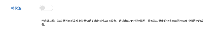 「开启此功能,路由器可自动发现支持畅快连的未初始化Wi-Fi设备,通过米家APP快速配网;修改路由器密码也将自动同步给支持畅快连的设备。」